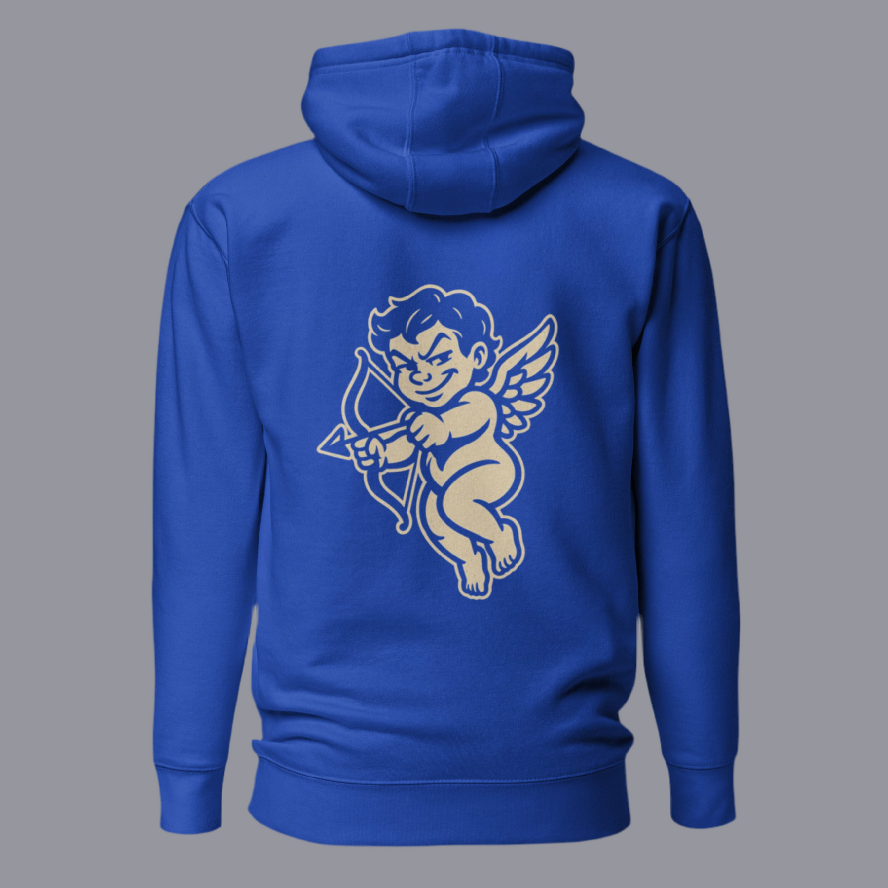 Back view of Guardfashions Complicated Pullover hoodie in Royal blue, featuring Cupid shooting an arrow in streetwear style.