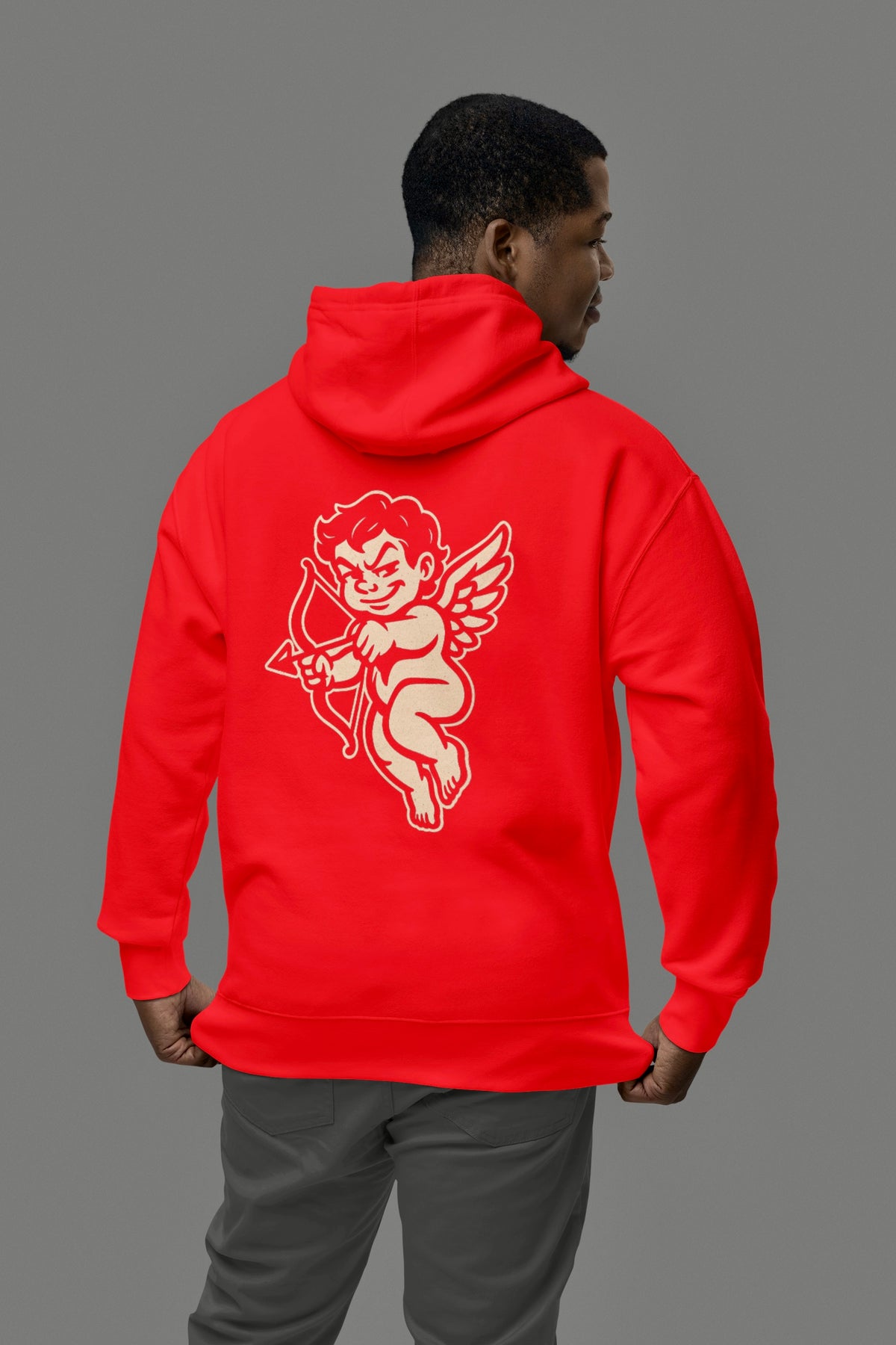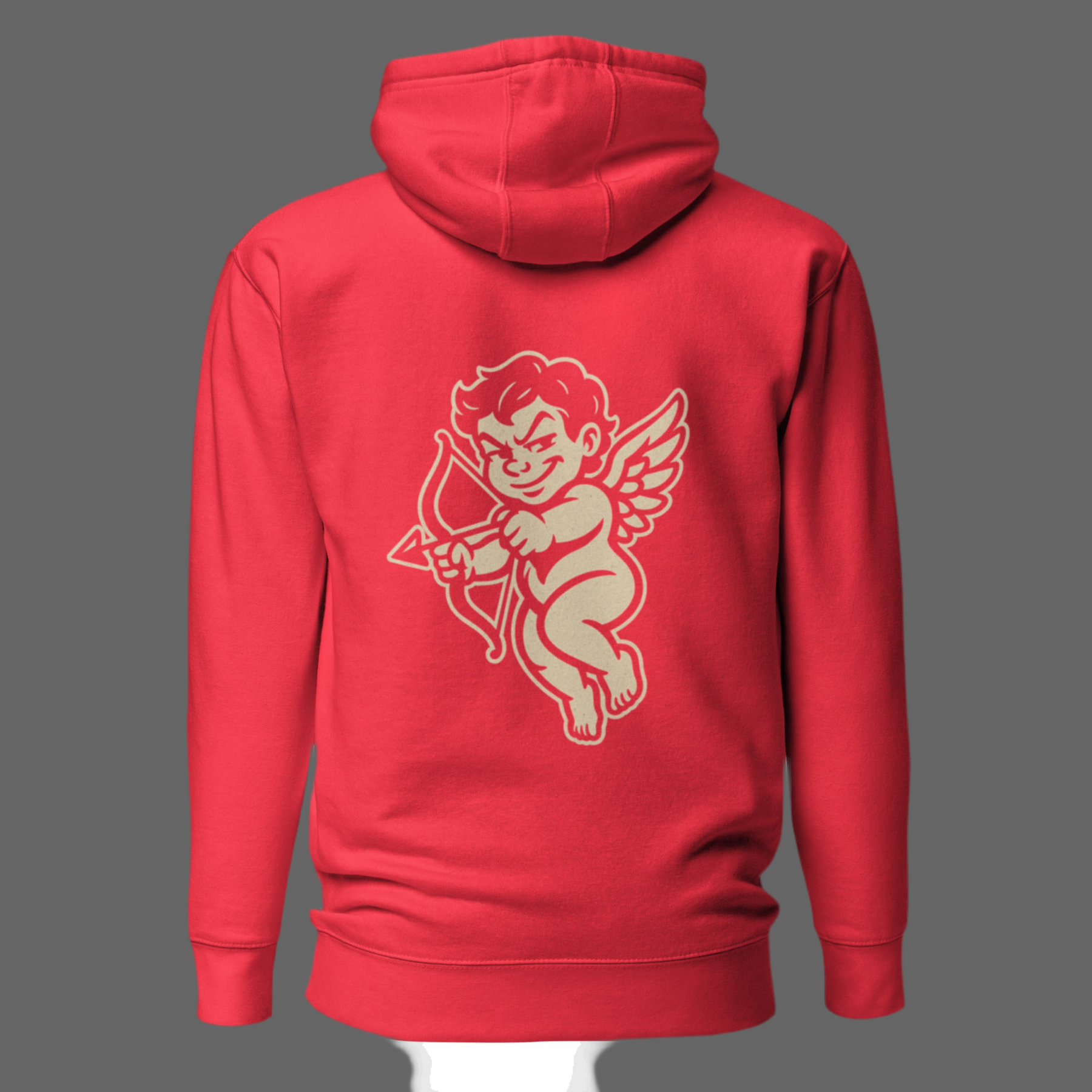 Back view of Guardfashions Complicated Pullover hoodie in red, featuring Cupid shooting an arrow in streetwear style.