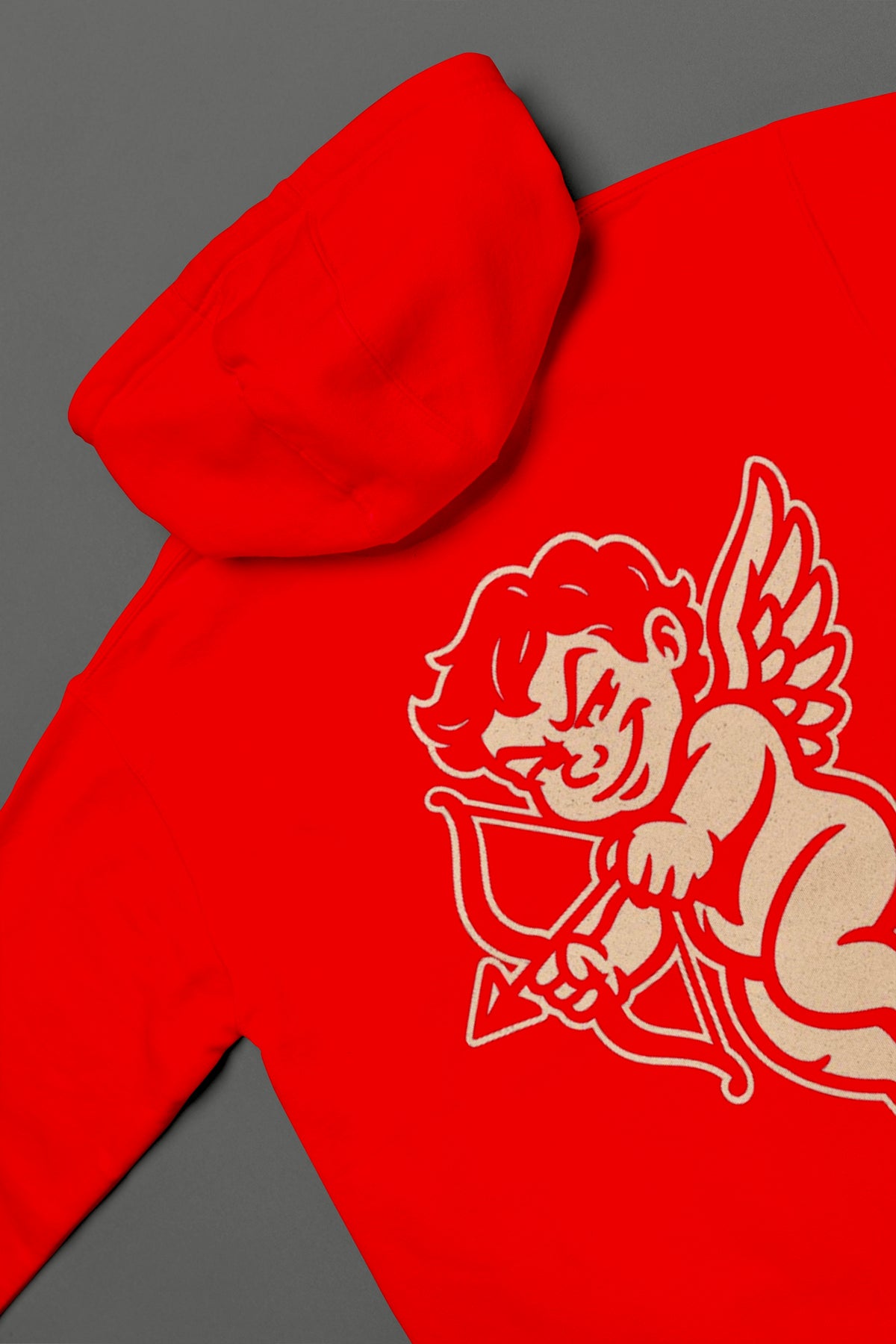 Back close up view of Guardfashions Complicated Pullover hoodie in red, featuring cupid shooting arrow graphic in streetwear style.