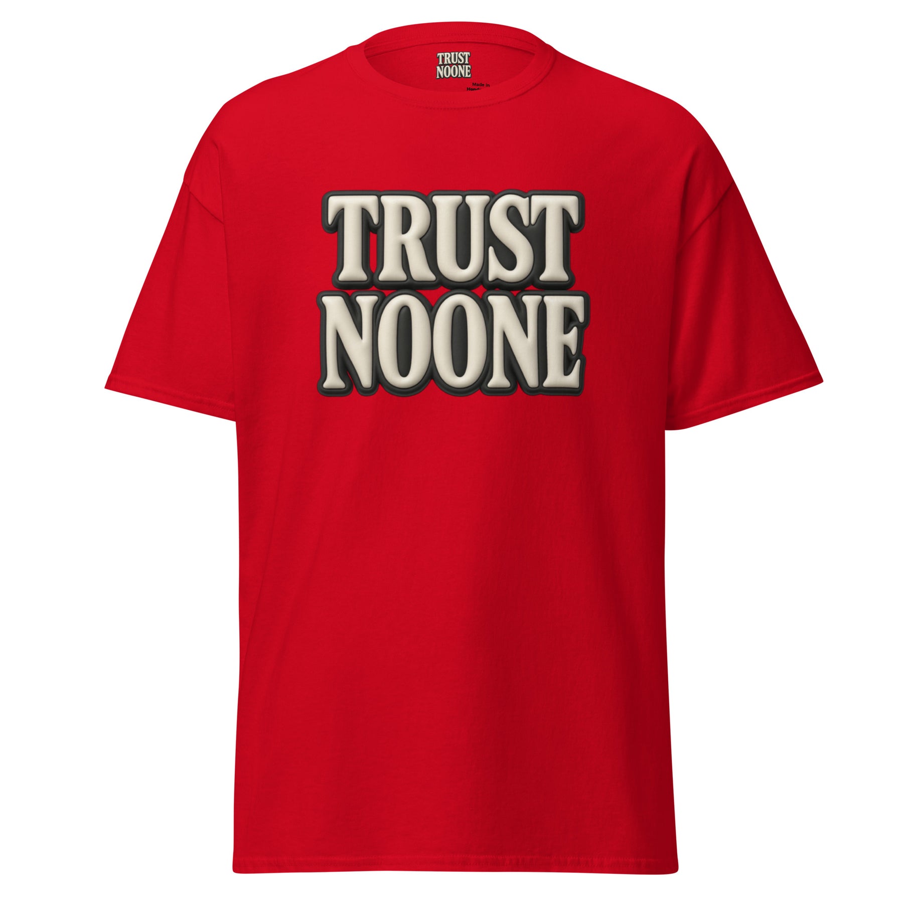 Front view of Trust No One Tee in red with bold beige raised text – Guardfashions streetwear