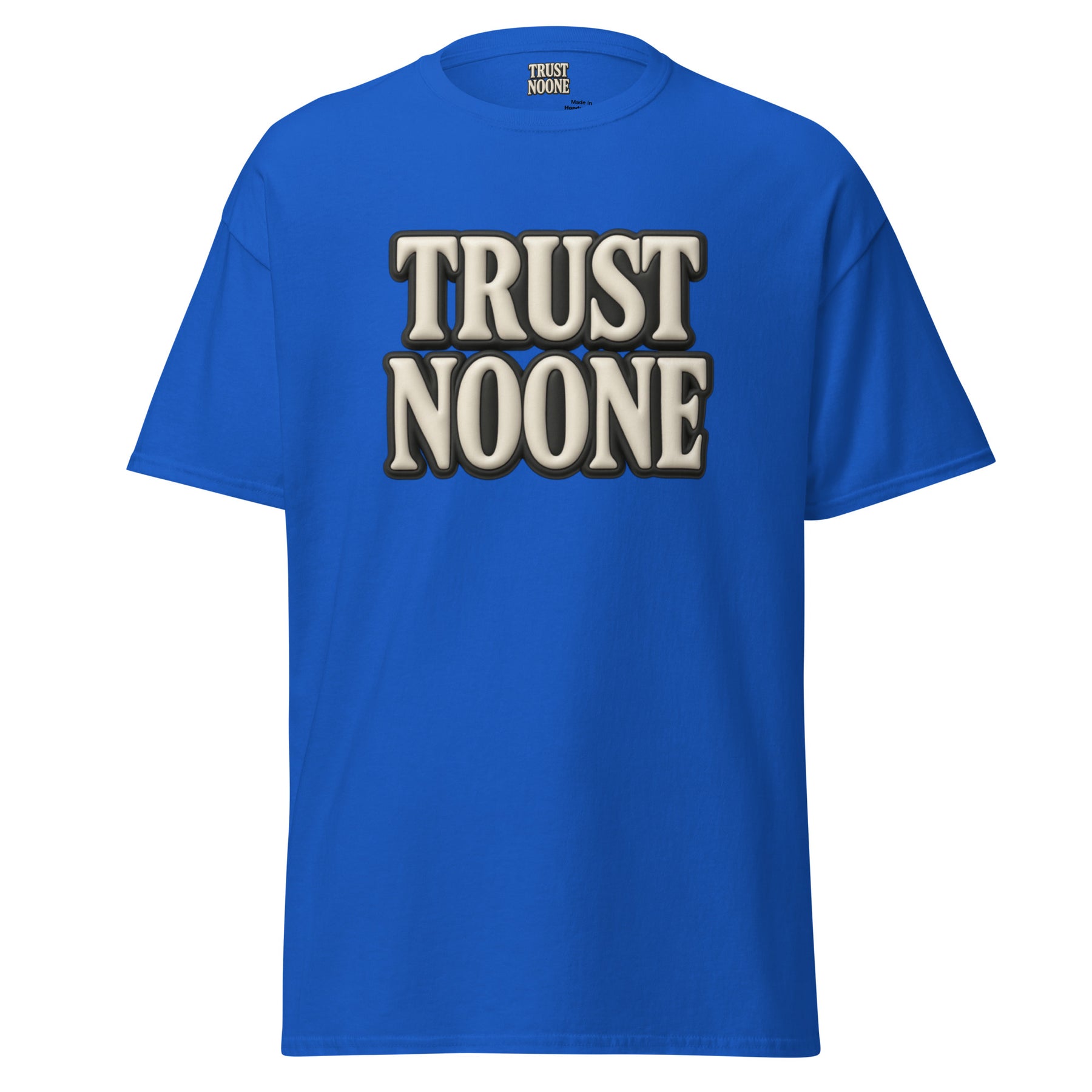 Front view of Trust No One Tee in Royal blue with bold beige raised text – Guardfashions streetwear